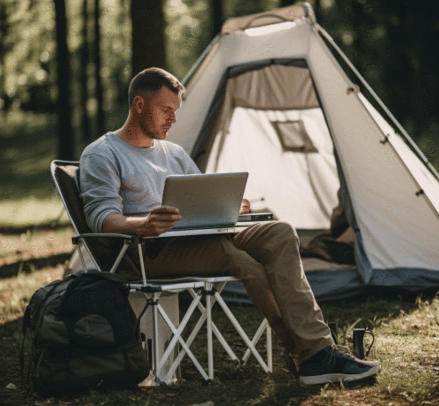A man working on a laptop in bed. Image produced using Midjourney